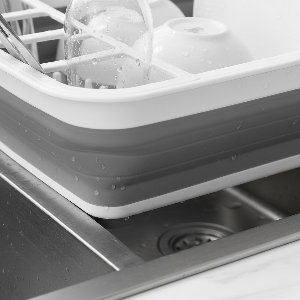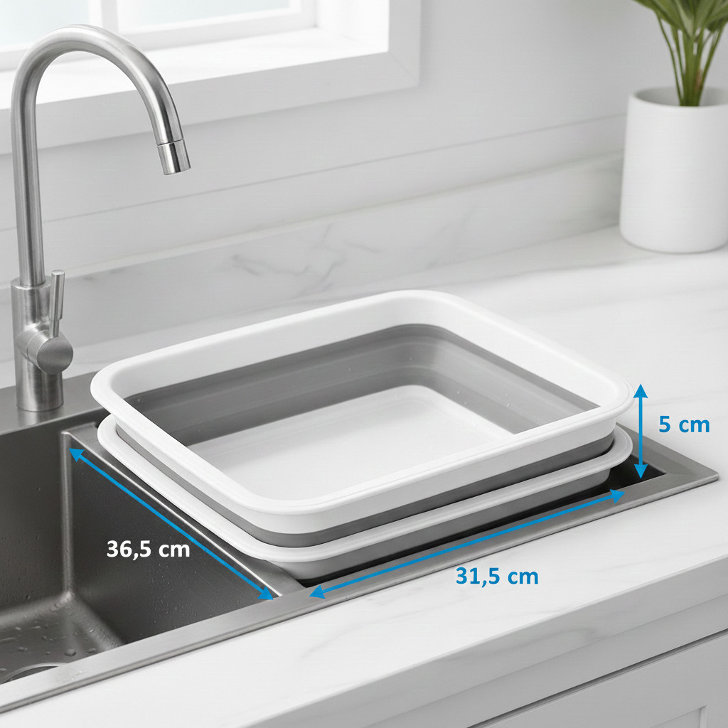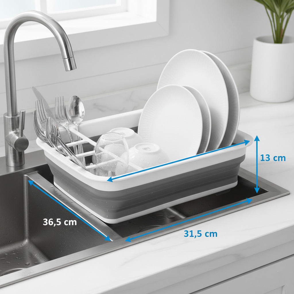 Economiza 70% do Espaço: Dobra completamente plano (apenas 5cm de altura!) e cabe em qualquer gaveta. Quando precisar, expande instantaneamente sobre a pia.